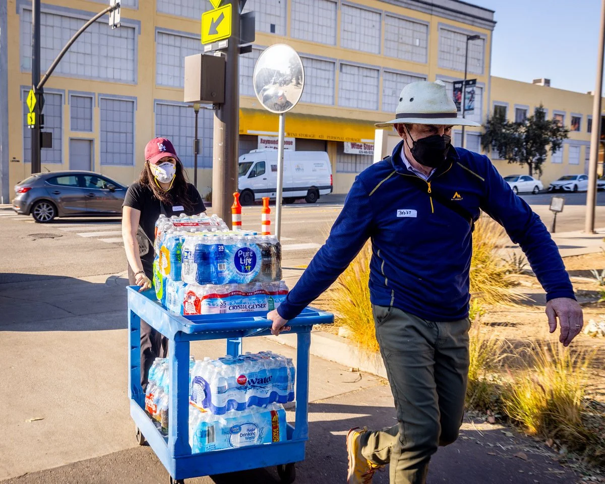 USHS Adult Center, Pasadena, CA. Volunteers transport bottled water to impacted Altadena residents.